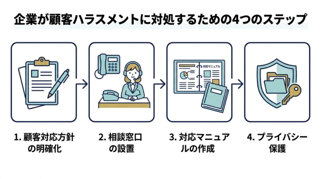 まず会社としてカスハラを容認しない立場を明確にし、全従業員に周知します。