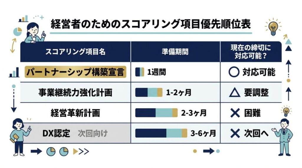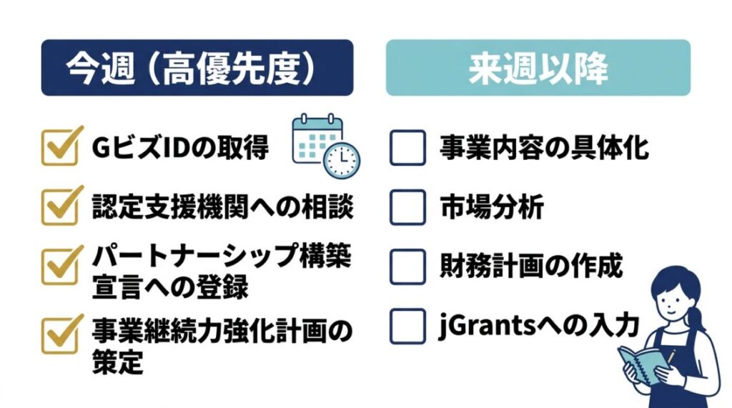 今週中に動ける優先度の高い行動は2つです。パートナーシップ構築宣言を登録すること、そして認定支援機関に連絡して加点の取得可能性を確認すること。事業計画書の完成度と加点の積み上げを並行して進めることが、採択の可能性を残す最低条件です。