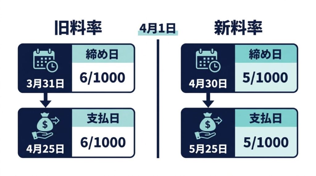 - 3月31日締め → 4月25日払い:締め日が3月31日のため、旧料率(6/1,000)を適用する