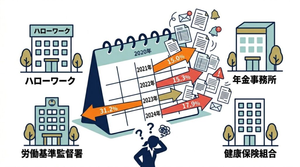 入退社に伴う手続きだけでも、ハローワーク・年金事務所・健康保険組合への届け出が発生します。なかでも手間がかかるのが、次のようなイレギュラー対応です。