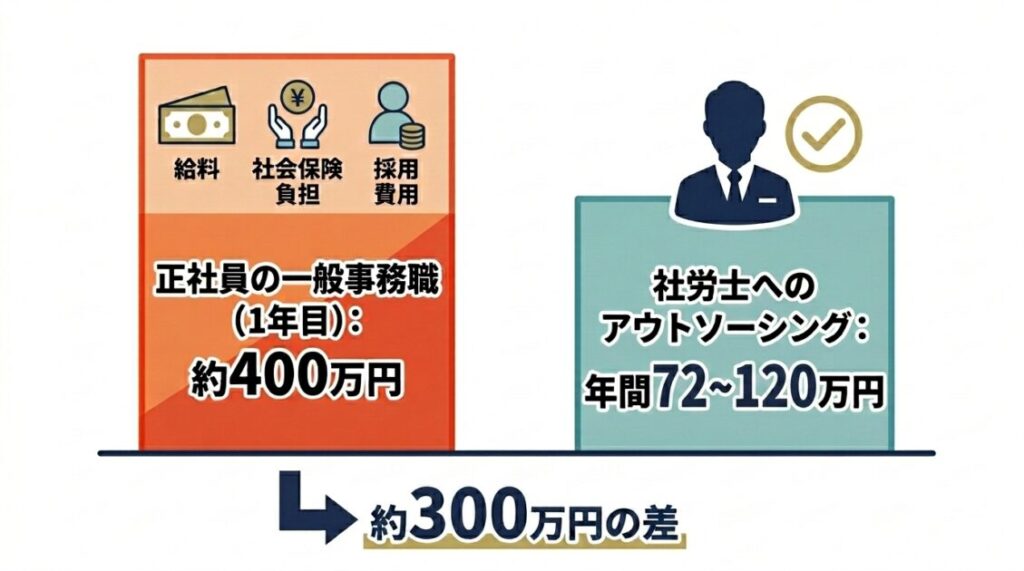 事務員1名の総コスト(給与・社会保険料・採用費・教育費)は初年度400万円前後に達します。社労士への外注費は年間60〜80万円程度が目安で、コスト面では外注が圧倒的に有利です。