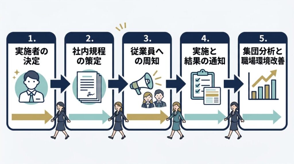 - 実施者は医師・保健師などの有資格者が必要。事業主や人事担当者は担当不可