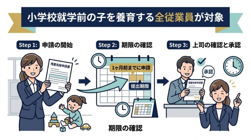 残業免除の正式名称は、育児・介護休業法に定める所定外労働の制限です。小学校入学前の子を養育する従業員が申請した場合、会社は所定外労働(残業)をさせてはならないとされています。