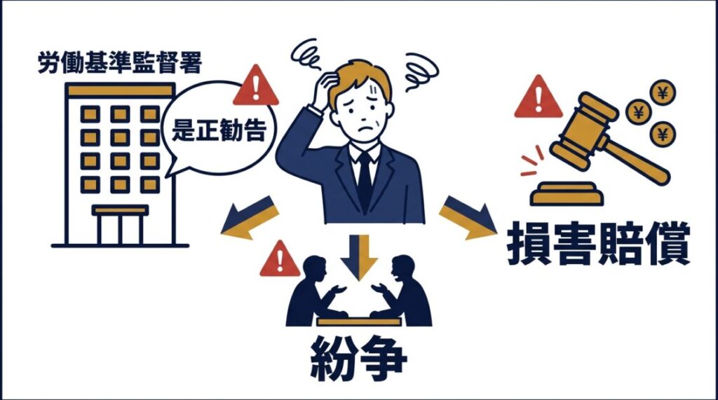 断った場合のリスクは、労働局への申告・紛争手続きへの発展・損害賠償請求と、経営へのダメージが広がる可能性があります。