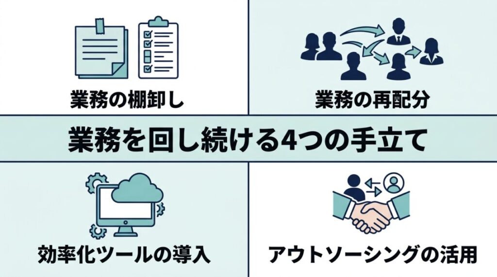 唯一取れる手段は、労使協定の締結による対象者の限定です。そのため経営者がすべきことは断る理由探しではなく、業務の棚卸し・分担見直し・効率化・外注化を組み合わせた体制づくりです。